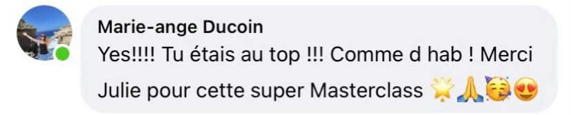 Julie a tenu à mettre ce challenge en place avec ces magnifiques personnalités parce qu'après plusieurs années à accompagner des coachs et des thérapeutes elle s'est rendue compte qu'il était important de travailler sur les différents domaines qui englobent la vie d'un entrepreneur.