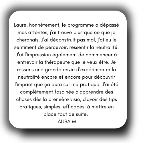 Formée aux Etats-Unis, elle a pu observer chez ses maîtres l'importance de la présence et du positionnement dans l'efficacité du travail. A présent thérapeute, facilitatrice et praticienne, elle vous accompagne pour aligner votre pratique sur les principes d'éthique et de neutralité qui lui sont chers.